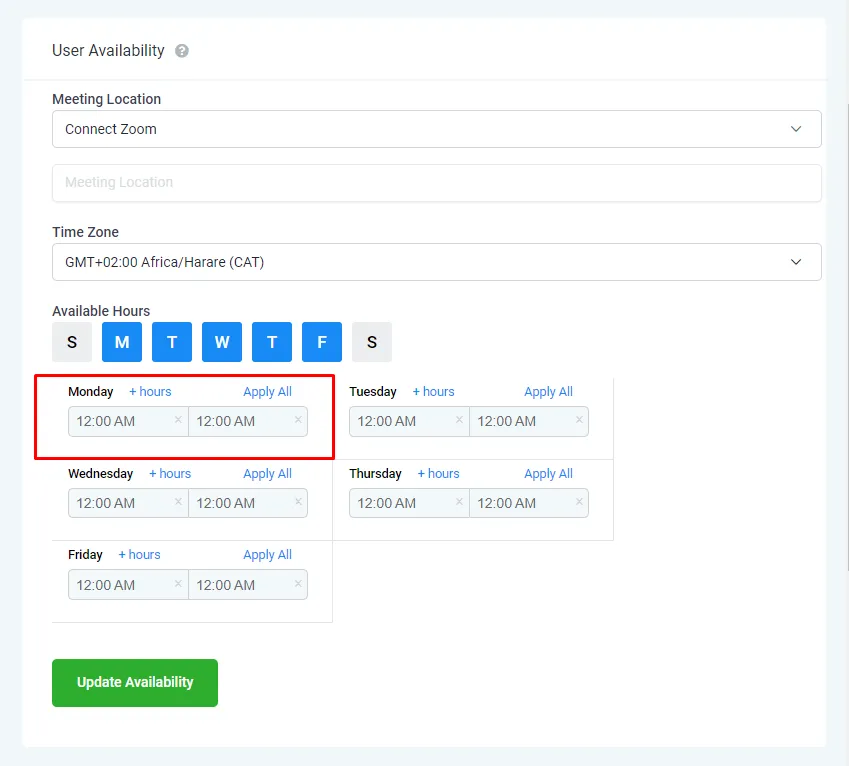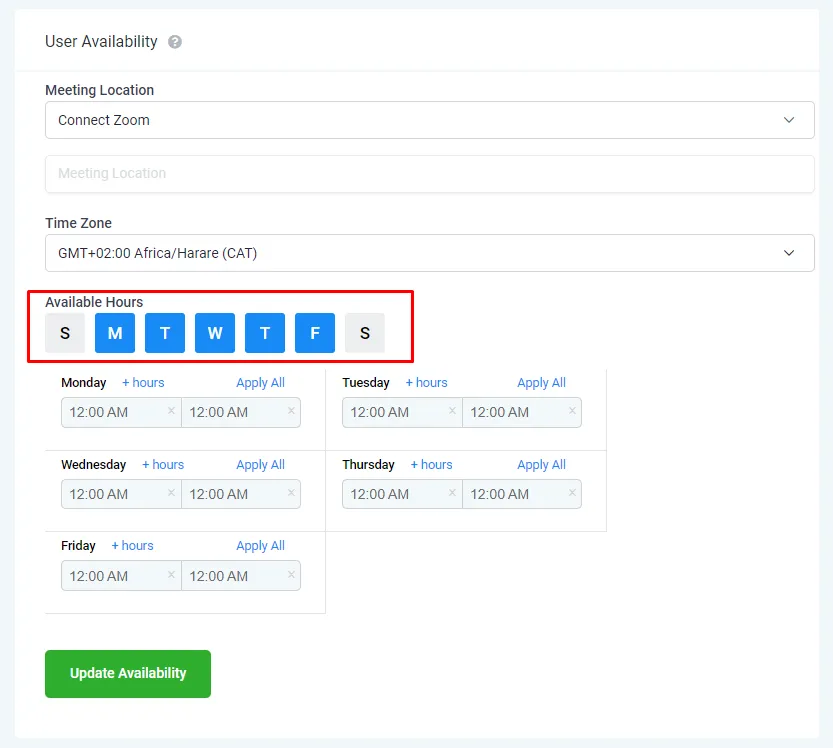 The "User Availability" feature enables you to select the days and times you are available for appointments. When clients try to book a meeting with you through the appointment system or the calendar you created for booking appointments, it will first check your availability in this section before showing available times to the client. This added check helps to ensure that appointments are not scheduled during times you are unavailable.